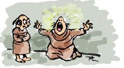 monk gets worried and goes down to look for him. He sees him banging his head against the wall